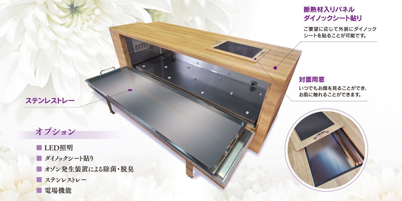 電場機能によって、ご遺体をパーシャル状態で保存できます。保冷庫の内部温度を0〜4℃に維持し、ご遺体を凍結させずに劣化を防ぎます。また、温度・湿度管理はもちろん、除菌・脱臭機能により、死臭や細菌による腐敗を防止し、通常1か月程度ご遺体は綺麗な状態で保管できます。