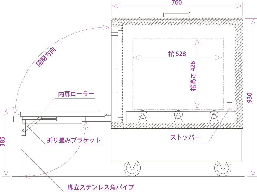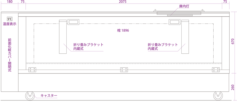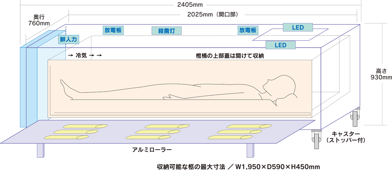 柩にご遺体を安置ししたまま、長時間保冷可能な移動式保冷庫です。
