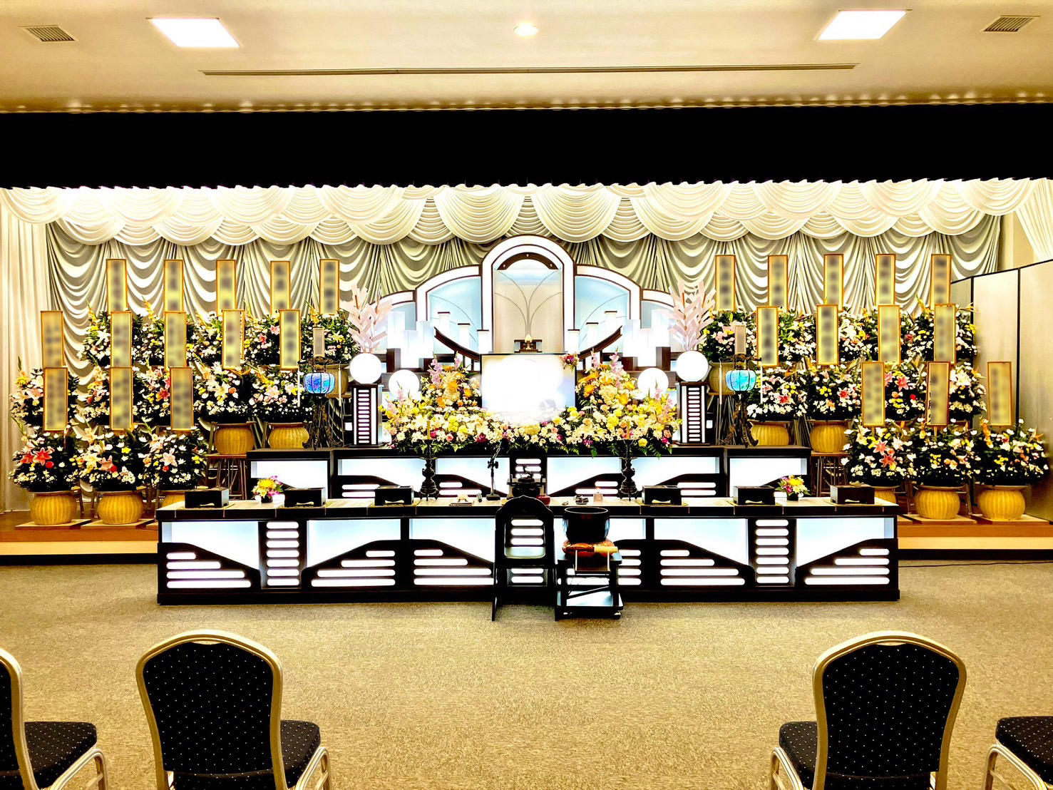 葬儀用 消耗品 納棺関連 ・仏衣 ・神式白丁 ・羽織 ・六文銭 ・吸水シーツ ・棺 ・担架布団 ・安置布団 ・ドライアイスパック ・顔当関係 ・メモリーシオン ・セーフティーセット ・プロガード ・納体袋(やすらぎシェラフ) 葬祭付属品 ・経机 ・御飾祭壇 ・後飾りセット ・遺影額 ・写真立 ・香炉 ・ローソク ・線香 ・焼香炭 ・位牌 ・骨箱 ・骨覆 ・分骨 ・骨壺 ・風呂敷 ・四華花 受付事務関連 ・葬儀記録書 ・御芳名カード ・書類箱 ・香典箱 ・事務用品セット ・香典バック その他 ・友禅棺掛 ・封棺の掛帯 ・手元供養品 ・エンディングノート 消耗品一覧へ 葬儀用 ホール用備品 式場関連 ・祭壇セット ・鳴物 ・鳴物台 ・曲録 ・焼香台 ・具足 ・経机 ・棺台 ・式場用椅子 受付・ロビー関連 ・受付机 ・返礼品用棚 ・受付金庫 ・コインロッカー ・ロビーテーブル ・ロビーチェアー ・屑入れ 控室関連 ・座卓 ・座椅子 ・座布団 ・屑入れ ・スタンドミラー ・金庫 会席場関連 ・テーブル ・テーブルクロス ・会席場用椅子 ・法事棚 ・引出物用棚 その他 ・玄関周り ・ホール用傘 ・アメニティーセット ホール用品一覧へ 葬儀用 装飾幕 ヨシカワ商事では、大切な方をお送りする式場を荘厳且つ厳粛な空間にするためお客様のご要望を十分にお聞かせいただき、オンリーワンスタイルでお客様の会場に合わせた装飾幕のご提案、オーダーメイドにて自社縫製工場で製作いたします。 一般的な会場から大きな会場まで柔軟に対応いたします。 ひとつひとつ丁寧に手作業で行っております。 特殊な縫い方も行える機械で理想の装飾幕を作成いたします。 お問い合わせはこちらから